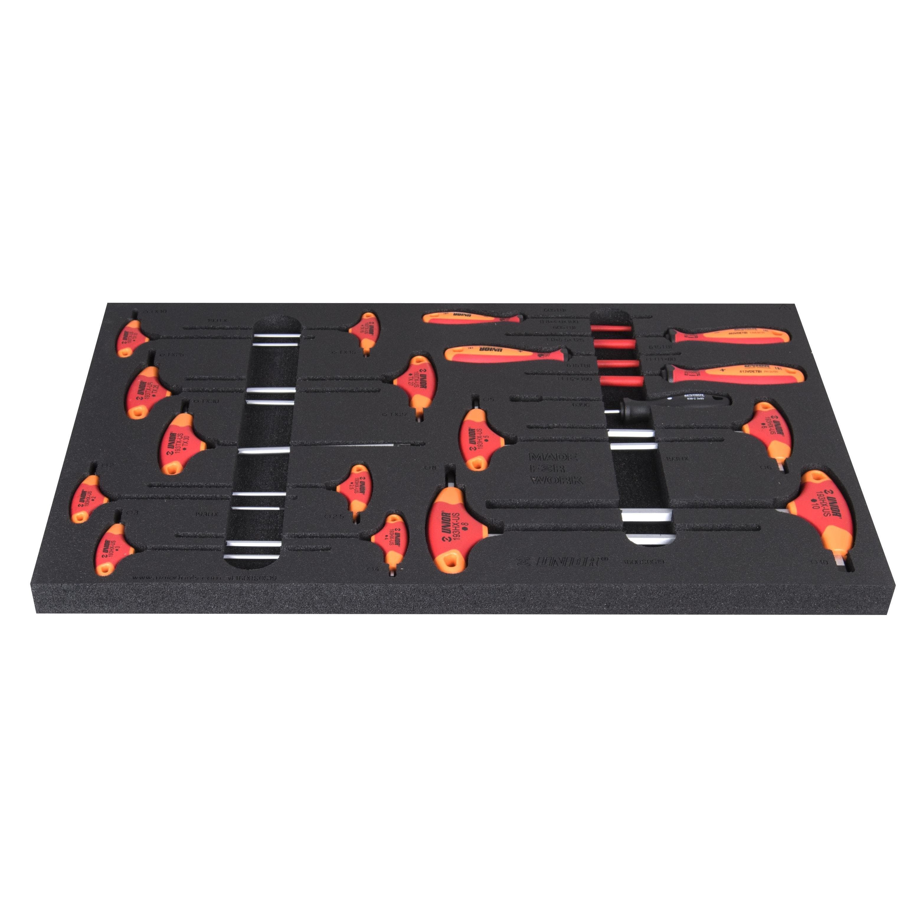 We took the tools from our Professional Mechanic Work Bench and adopted the SOS inserts to fit drawers of our trolleys. The selection of tools is now available in seven individual trays made of high-quality foam (from model 1600SOS13 to model 1600SOS19), where each tool has its own place. Foam trays fit all models of Europlus, Eurovision, Eurostyle and Hercules carriages.